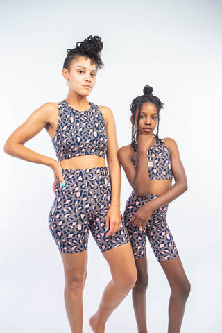 Leopard print soft stretch sports bra with matching high rise active shorts