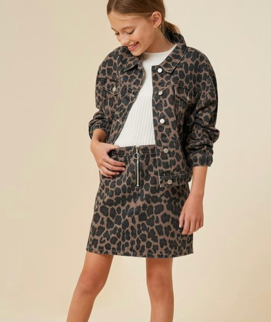 Cheetah print skirt with silver zipper detail and matching cropped jacket.