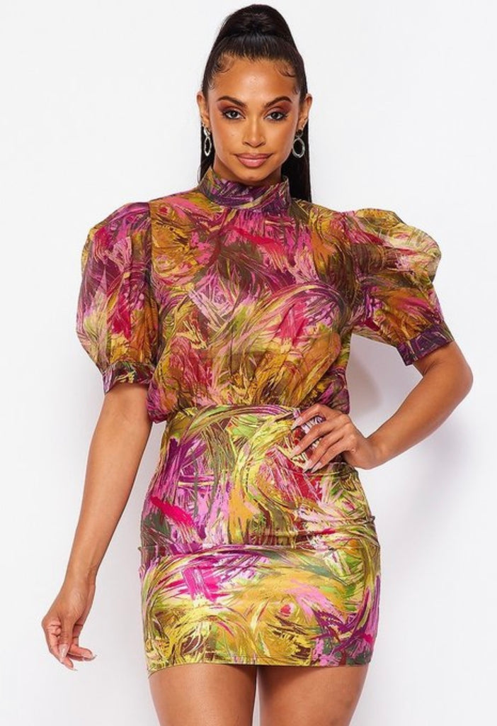 Printed , Zipper back, puff sleeve detail dress with great stretch
