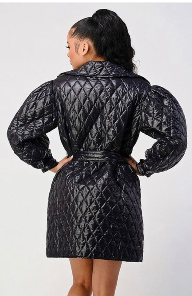 Collard puffer jacket with waist belt and button closure