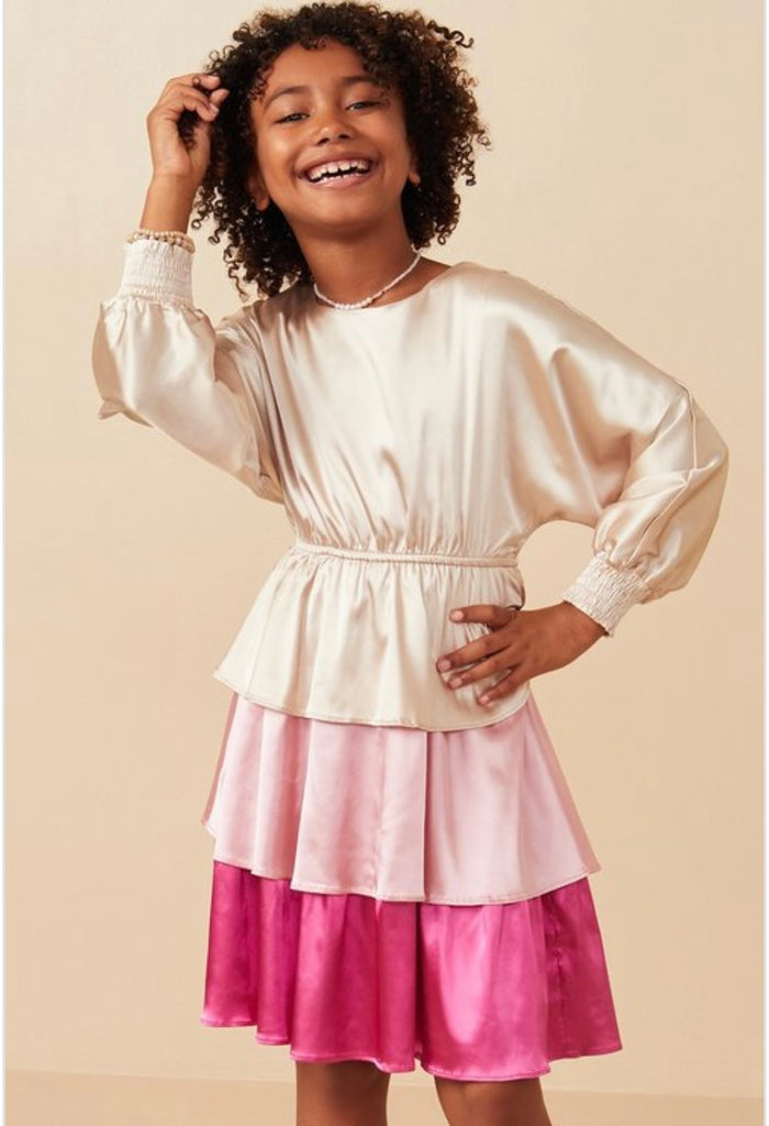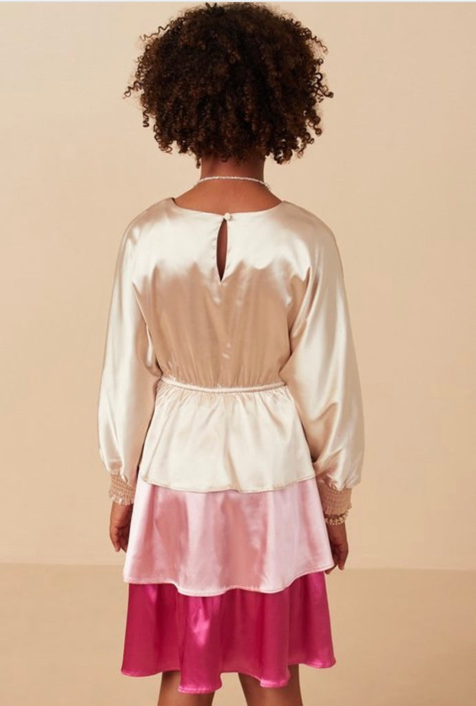 Girls Tiered Color Block Satin Dress