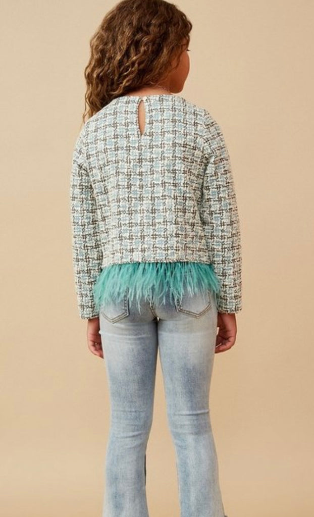 Girls tweed top with feather accent